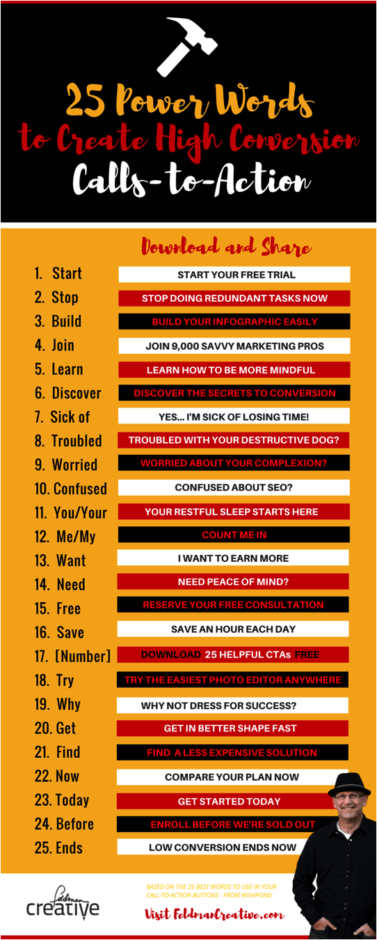 I came across this infographic by Barry Feldman on Social Media Today with a whole list of powerful calls-to-action (CTAs) that you can easily adapt to your business.